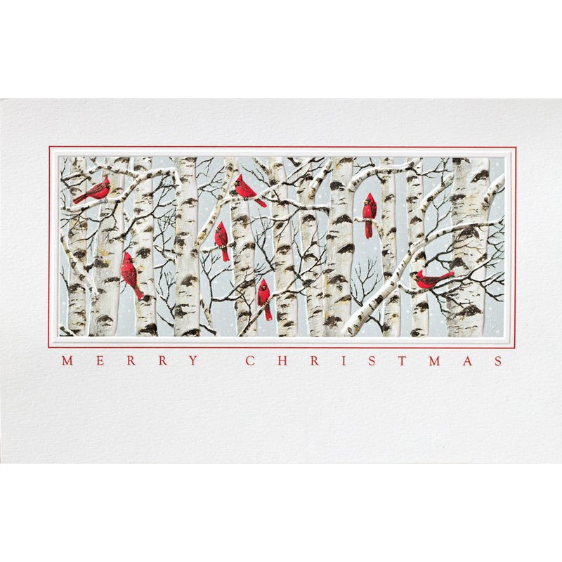 Send your loved ones these Cardinal Crazy Christmas Boxed Cards for festive season's greetings. These cards feature vibrant red cardinals perched on the bare branches of snow-covered birch trees in winter.Artist: Kathy GlasnapContains: 16 cards and 17 enve