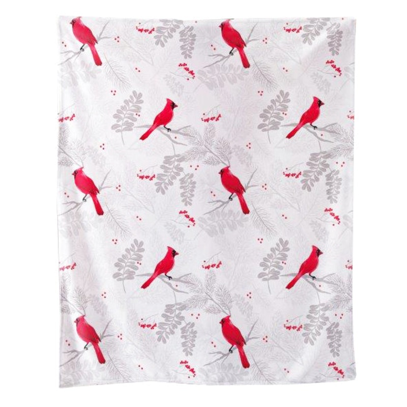 Stay warm and cozy with this Cardinals Faux Fur Throw Blanket. It is made of warm, plush fabric with a beautiful print of red cardinals and berries against a background of soft gray leaves. Makes a great gift for the holidays!Dimensions: 50 x 60 inchesFaux