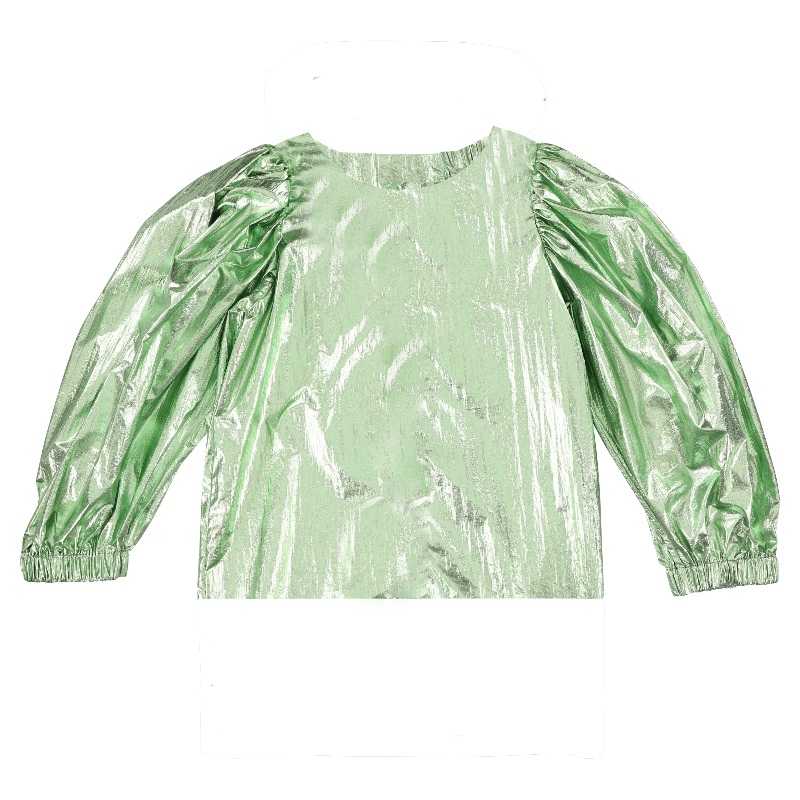 caroline bosmansmetallic top in green features ruched shoulders with dramatic puff sleeves and elasticated wrists for contrast.