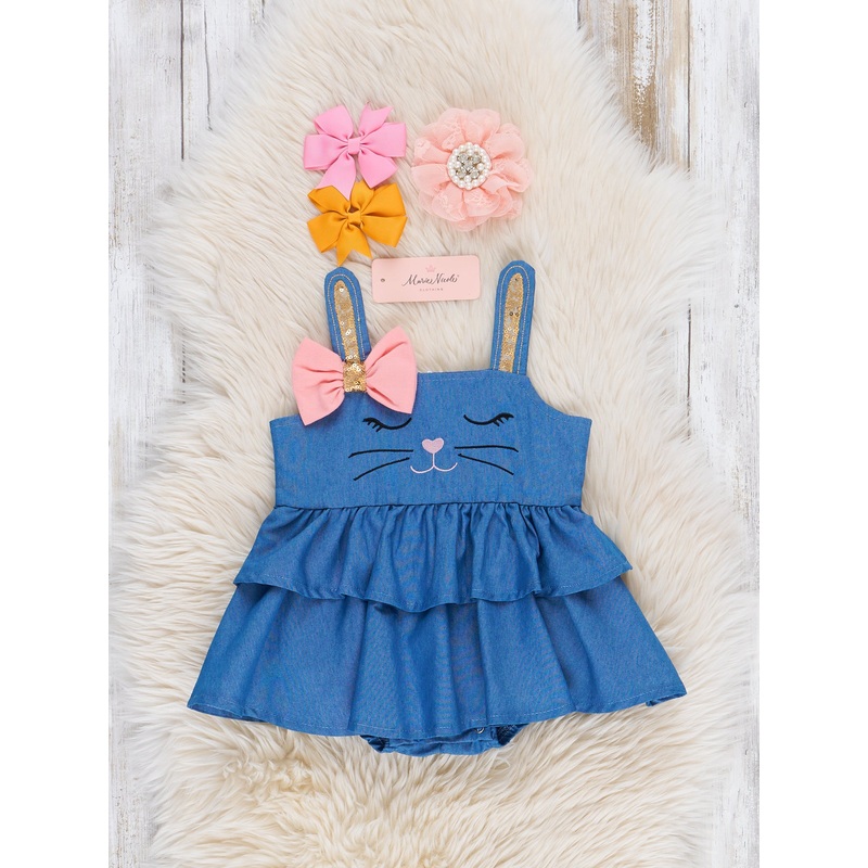 Hop into Easter with our Chambray Bunny Bow Tiered Ruffle Bubble! Made with soft chambray fabric, this adorable bubble features an embroidered bunny face and a tiered ruffle overlay. Perfect for Easter, this bubble also has a zipper back closure and is ava