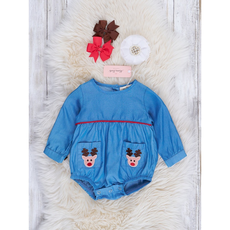 This sibling set is a charming blend of casual elegance! The chambray fabric offers a relaxed feel, while the embroidered reindeer adds a festive touch. Perfect for holiday gatherings or a day out, this bubble effortlessly combines comfort and style for yo