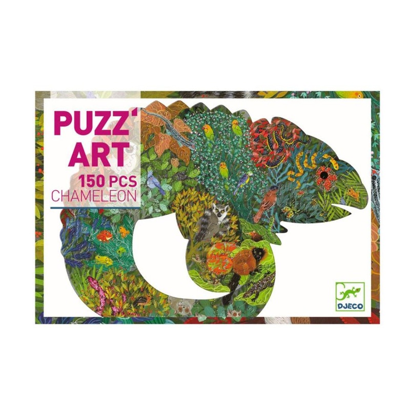 Djeco Puzz' Art has no corners or edging, just a beautiful silhouette of a chameleon with other creatures of the jungle illustrated on the pieces. For ages 6 and up. WARNING: CHOKING HAZARD - Small Parts. Not for children under 3yrs.