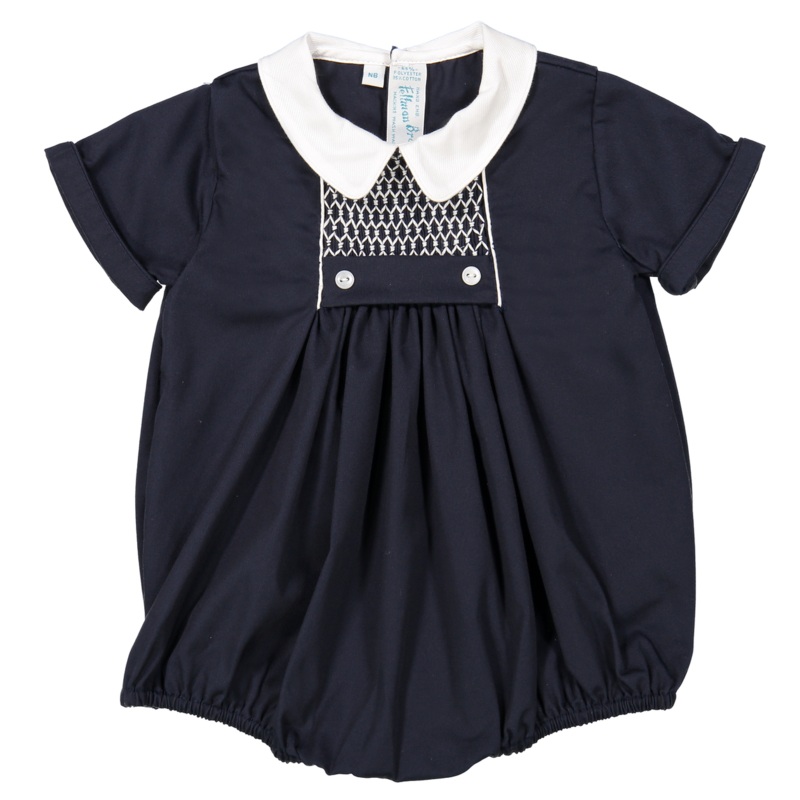 This is the perfect creeper, sweet and classy for your little man! Check out the beautiful chevron smocking design, expertly hand made. Just below that is a waistband with two sweet little buttons in tuxedo style – sure to make your little one look like a real gentleman. Loose pleats descend from the waistband to the bottom of this piece, ending in elastic over the leg holes. This creeper features a white pique collar and folded over cuffs, adding to the vintage look. The perfect outfit for formal occasions, baby’s first portrait, or everyday baby boy layette.
