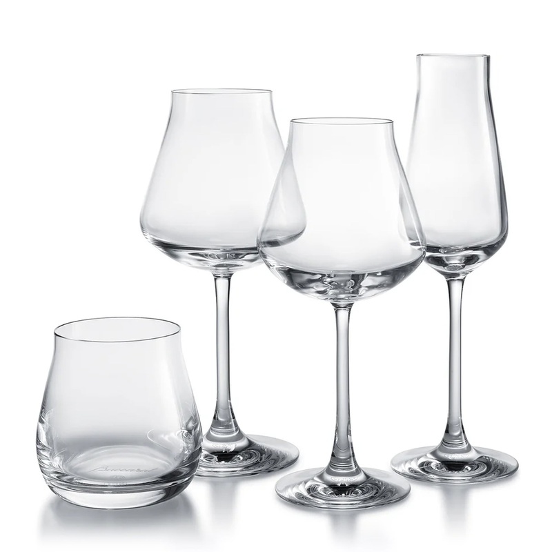 Contains 4 glasses: one champagne flute, two wine glasses, one tumbler. Fine, hand-blown crystal. Made inBaccarat, France.