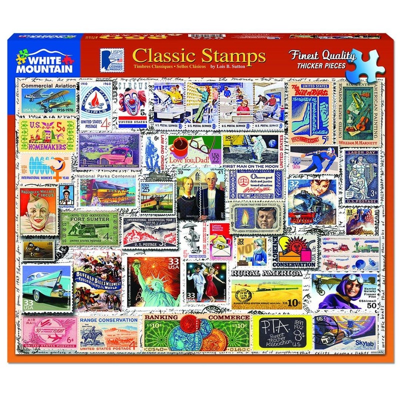 Classic Stamps. Camp Fire Girls, The Bill of Rights, JFK, Disco, Labor Day, Nursing, Skylab, National Parks Centennial, American Gothic, International Women's Year and Clowns are but a few of the classic stamps assembled on this 550 piece puzzle by Lois B.