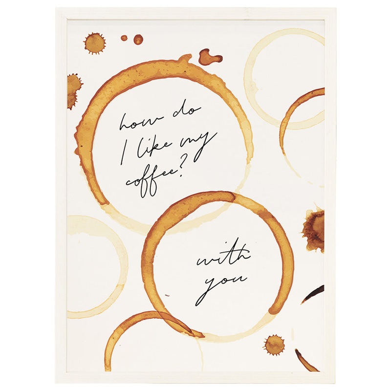 This simple and charming Coffee With You Thin Frame Art is perfect for coffee corners. It features a slender rustic frame that complements the artwork within. The artwork features watercolor rings and splatters in coffee brown with the sentiment presented in black, handwriting-style lettering.