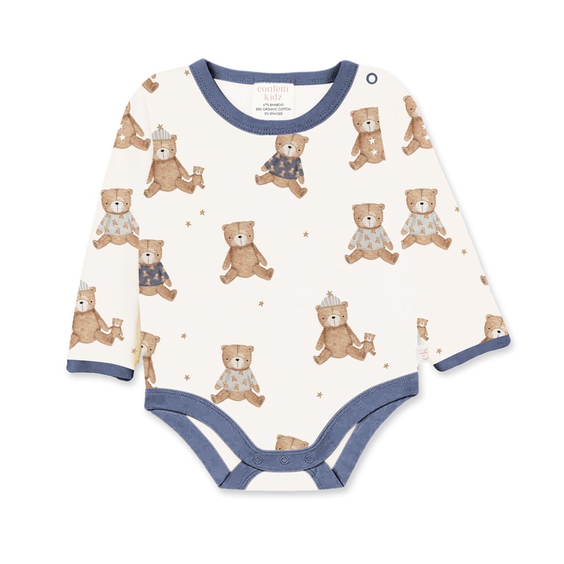 This long sleeve bodysuit, adorned with a charming teddy bear print is the perfect causal winter or mid season bodysuit.Features:Made from soft blend of bamboo and organic cottonSuper soft and breathable fro maximum comfortSnaps at the crotch for easy chan