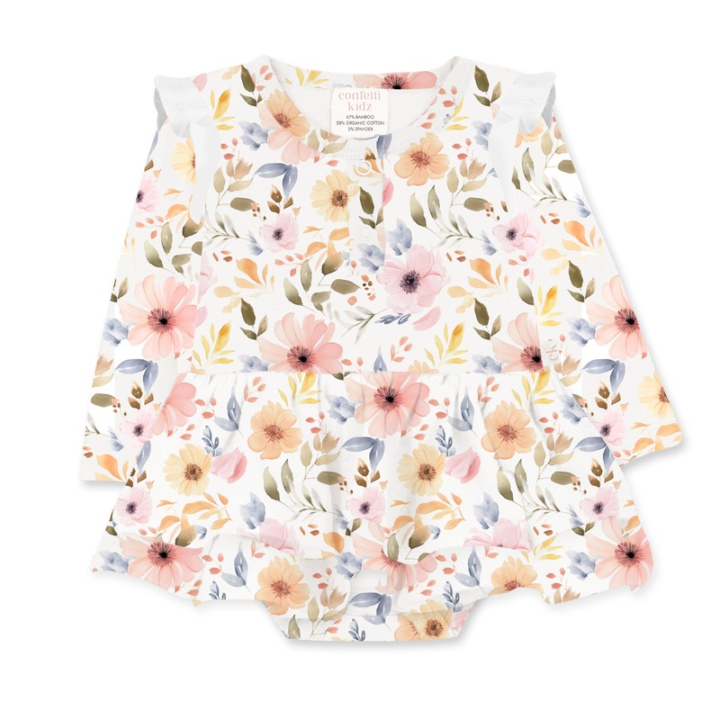 This Sweet Florals Bodysuit Dress is the perfect seasonal essential. Made from a soft bamboo and organic cotton blend, it combines the comfort of a onesie with the charm of a dress, keeping your baby cool and stylish on warm days.