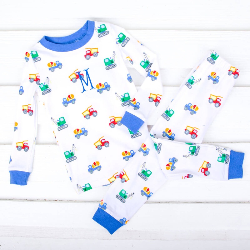 Your little builder will adore our Construction Truck Pajamas. These fun pajamas feature cool construction truck print, including a dump truck, a crane, and a cement truck, making them a fun and stylish choice for bedtime. The set includes a cozy long-sleeve pajama top and matching pull-on pajama pants, providing the perfect combination of comfort and style. Personalize these pajamas with a monogram for an adorable touch! Whether it’s for a good night’s sleep, lounging, or simply enjoying a comfortable bedtime routine, your little one will love these pajamas.