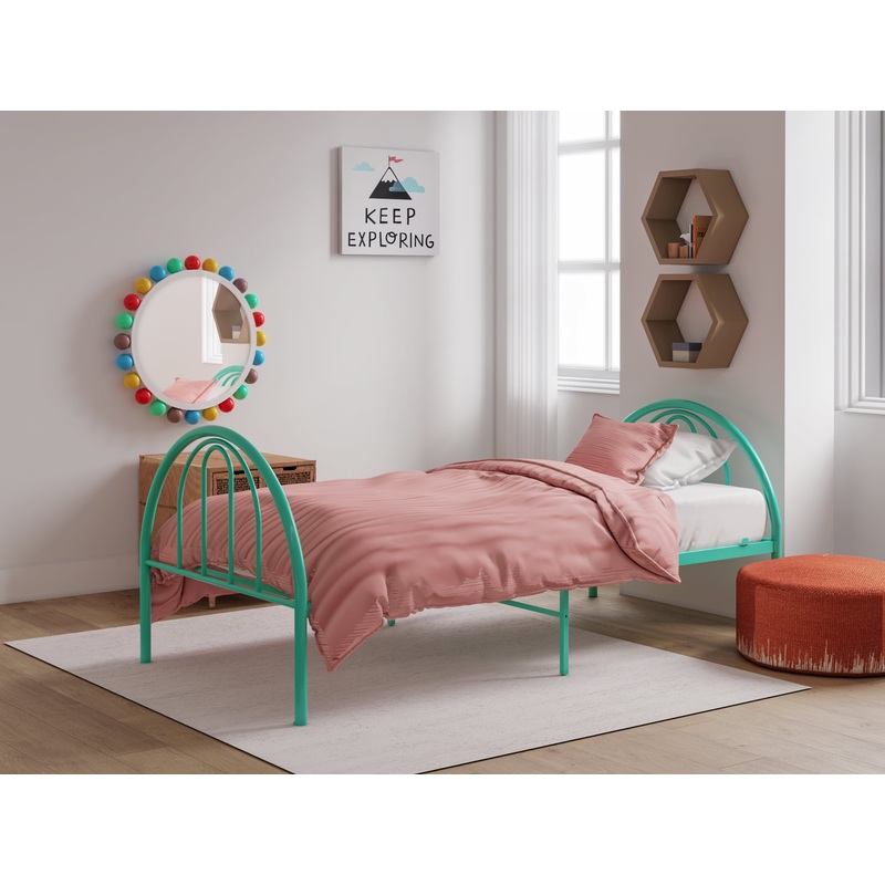 The simple yet stylish lines of the arched head and foot board make the Brooklyn Metal Twin Bed a perfect fit in any bedroom. It’s available in a variety of classy finished colors; Black, White, Blue, Red, Gray, Turquoise, and Pink. This kid’s metal bed can serve as a fashionable backdrop for any designer’s imagination. The solid steel construction of this twin bed makes it a durable choice for your child’s bedroom. The woven mattress support means this steel bed for kids does not require a box spring or Bunkie board. Pair this twin metal bed frame with a mattress and sheets that match your decor to complete the look. This bed is big enough to give a cozy and comfortable night’s sleep to your child. It is designed for use with a child ages 4 years and older. With a durable finish it is easy to clean and maintain. The Brooklyn Metal Twin Bed is a must-have for your child’s bedroom.