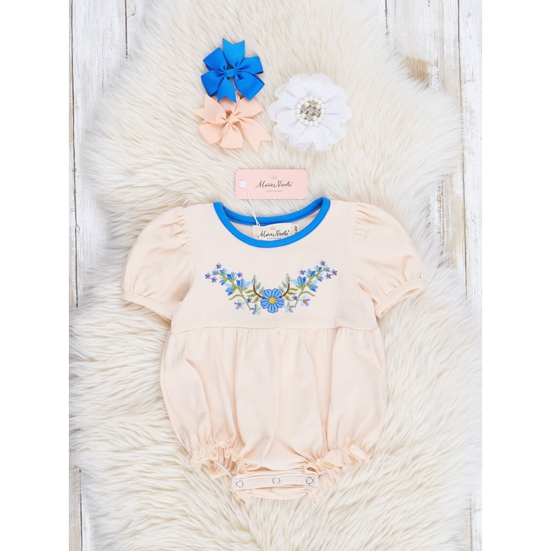 Sweetand charming, this Cream & Blue Embroidered Garden Ruffle Bubble is perfect for any little girl. Made with soft fabric and adorned with dainty bouquets, it features a cinched waist and leg openings for a comfortable fit. Complete the look with the matching sister set for an adorable duo.