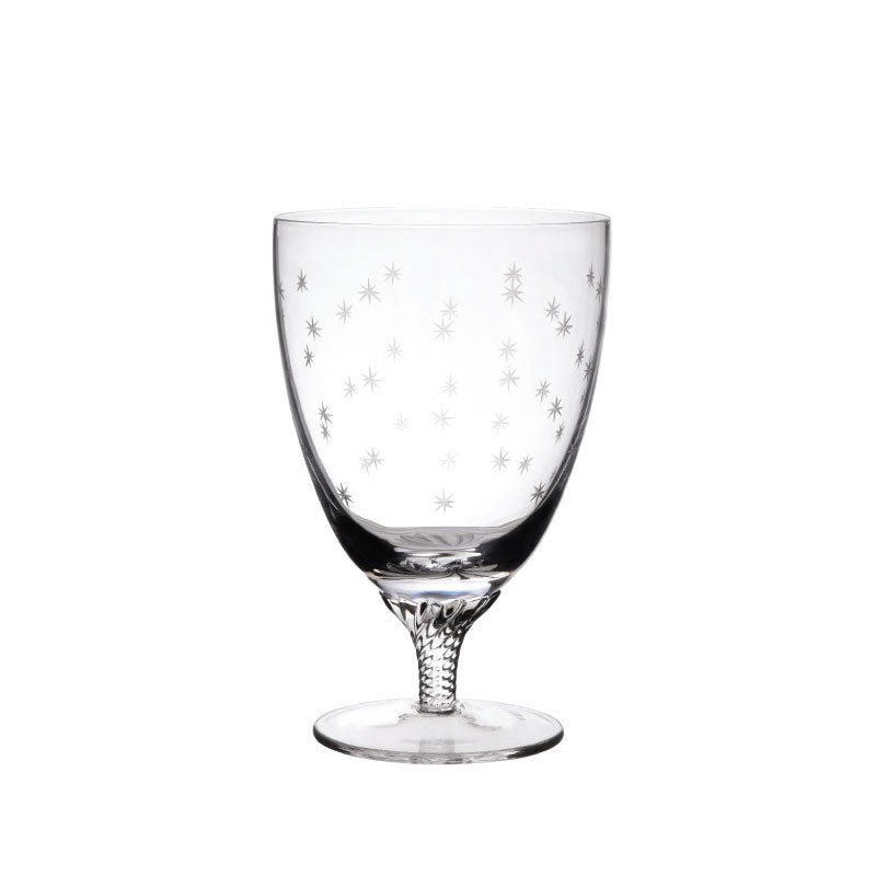 Fine crystal. Each glass has been hand-blown and hand-engraved, with a short twisted stem.