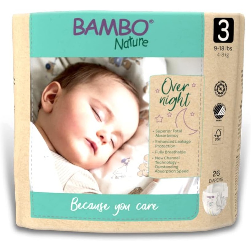 Bambo Nature Overnight Baby Diapers (Sizes 3 TO 6), Size 3, 104 Count Bambo Natures Overnight Diapers are specifically designed for nighttime use. Our unique Channel Technology is meant to absorb large volumes of liquid incredibly fast so that your baby ca