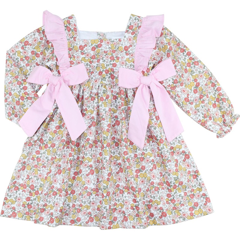 Bright and whimsical, this Fall Corduroy Floral Bow Dress features a colorful floral print accented by bold pink ruffle straps and oversized bow details. The long sleeves and gathered skirt create a sweet, timeless silhouette perfect for fall celebrations.