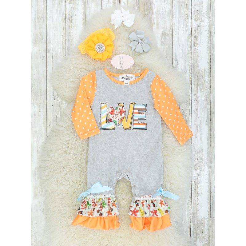 You will fall in love with this romper! It features polka dot raglan sleeves, fall scenery details, & ruffles.