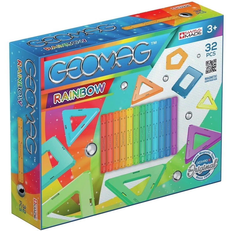 This rainbow starter kit is the perfect introduction to the world of Geomag. Only a few pieces will allow you to create your first magnetic constructions with all the colors of the rainbow! The rainbow 32-piece box set includes 12 magnetic rods in the colors of the rainbow, 9 steel spheres, and 11 colorful shape panels. The Geomag rainbow set meets the needs of the most unbridled creativity. Amazing fun with an explosion of colors. Magnetic rods and non-magnetic steel spheres that come together to create a huge number of shapes. Geomag platforms allow for even more rigidity to structures, allowing to carry creations more easily. The spheres click into the platform and can remain there, becoming a base for endless construction possibilities. Geomag classic is an inventive system of simple construction made of 58 mm magnetic rods and steel spheres. A huge number of shapes, geometric figures and models of every kind can be constructed. Geomag stimulates creativity and logical reasoning. The variety of the shapes and their transformations make it possible to renew structures continuously. Imagination is all that is needed to create a unique masterpiece. Geomagworld SA is the manufacturer of Geomag toys. All products are designed both to entertain and to stimulate the imagination and curiosity. Geomag toy can also become an amusing pastime for the whole family, reuniting parents and children in an activity of extraordinary creativity. Geomag is produced in line with the strictest criteria of quality and safety typical of Swiss products and is manufactured in compliance with stringent European and American Safety standards. For ages 5 and up. WARNING: CHOKING HAZARD – Small Parts. Not for children under 3yrs. CHOKING HAZARD — Toy contains a marble. Not for children under 3 yrs. CHOKING HAZARD — This toy is a marble. Not for children under 3 yrs.