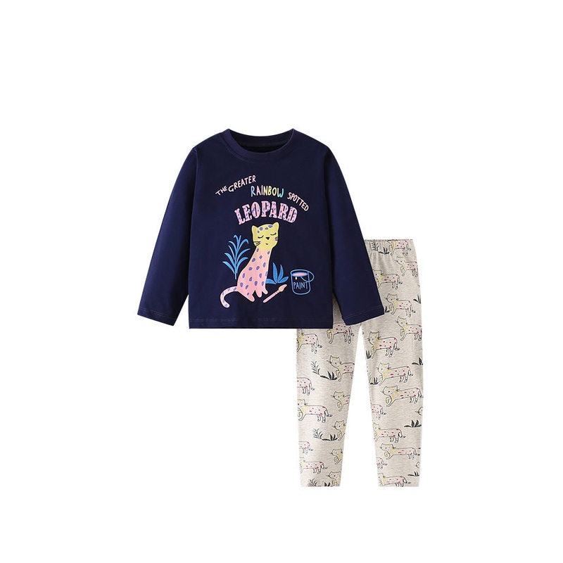 This top and pants set features a vibrant leopard cartoon animals printing design, perfect for adding a fun touch to any girl's wardrobe. Made from high-quality materials, it offers both comfort and style. A must-have for any young fashionista.COLORNavy Bl