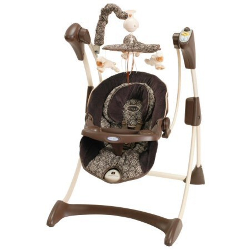 From invention to innovation, we take great pride in all of our swings, and that?s why we are proud to introduce the Silhouette Swing. The swept style frame blends flowing lines, ideal proportions and purposeful details to define quality and comfort. The fabric covered motion mobile creates a sophisticated look and rotates with the swings own movement- no additional batteries needed! It includes 3 plush mobile toys for visual stimulation when the baby is reclined. For added comfort this swing includes 2 speed vibration, a removable double infant head support, upgraded machine-washable seat pad, and 3-position recline. With 6-speeds the Silhouette swing provides multiple speed choices and enhanced electronics with classical music and nature sounds for your baby?s enjoyment. The innovative OpenTop? design, along with a one hand flip-up tray, makes getting baby in and out fuss free while the 5 point harness system keeps baby secure. The new Graco Silhouette Swing combines style for you and comfort for your baby!