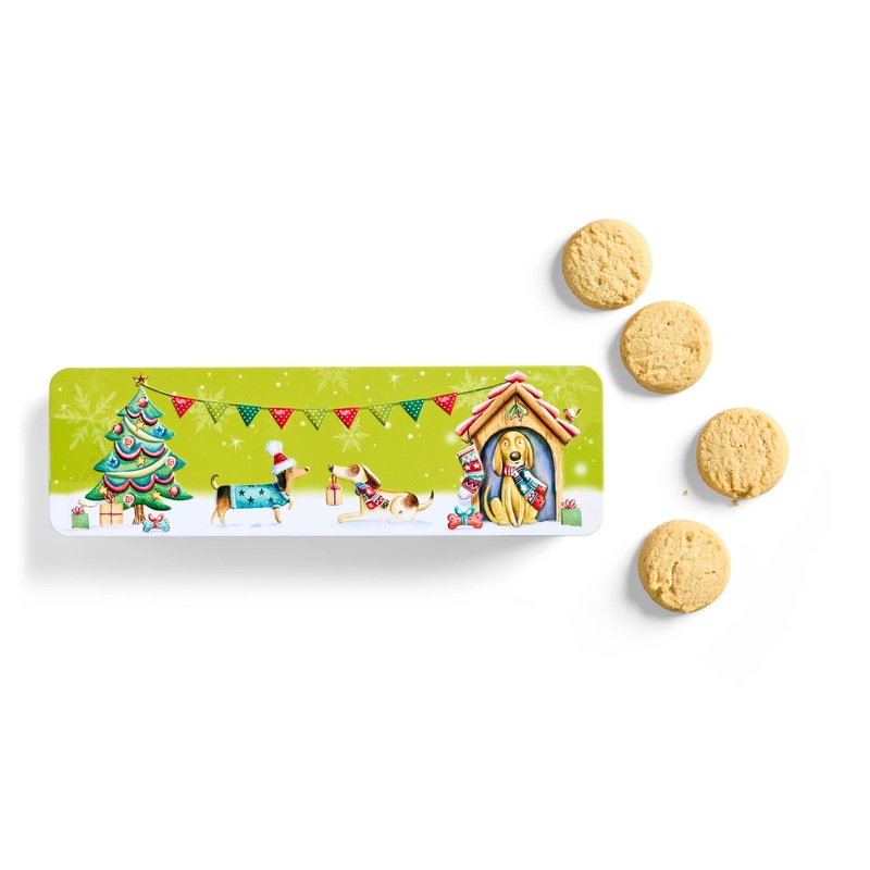 BEST BEFORE AUGUST 9TH 2025This beautifully embossed tin is illustrated with an adorable dogs Christmas party theme specially for all the dog lovers. This memento biscuit tin contains Clotted Cream Shortbread Biscuits, made with indulgent clotted cream, fo