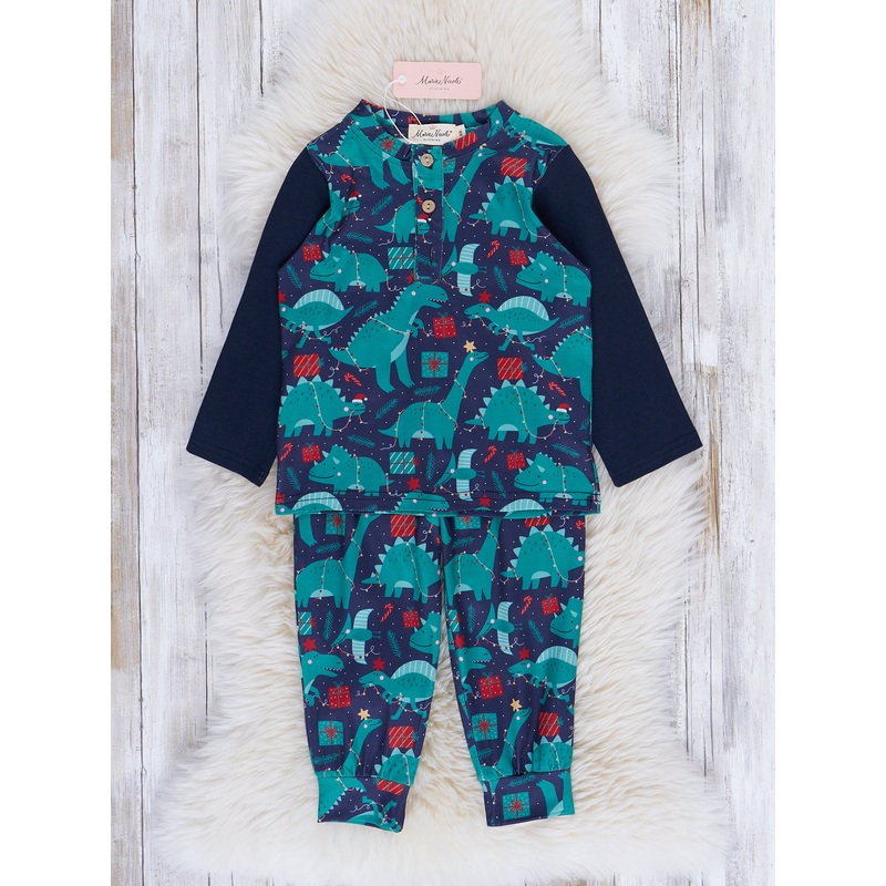 Let your little explorer embark on a Christmas journey with our Dino Wonderland Pajama Set. In cool shades of green and blue, these PJs feature adorable Christmas-themed dinosaurs because who says dinos don't celebrate the holidays, too?Make bedtime a fest