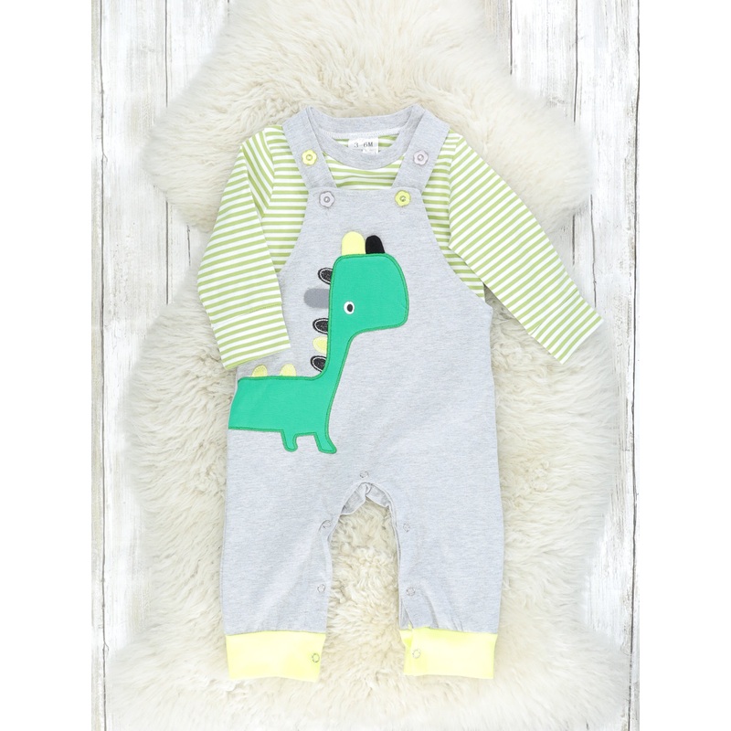 This adorable outfit is dino-mite! This outfit features a green striped long sleeve top& grey overalls with the sweetest dinosaur appliqu.