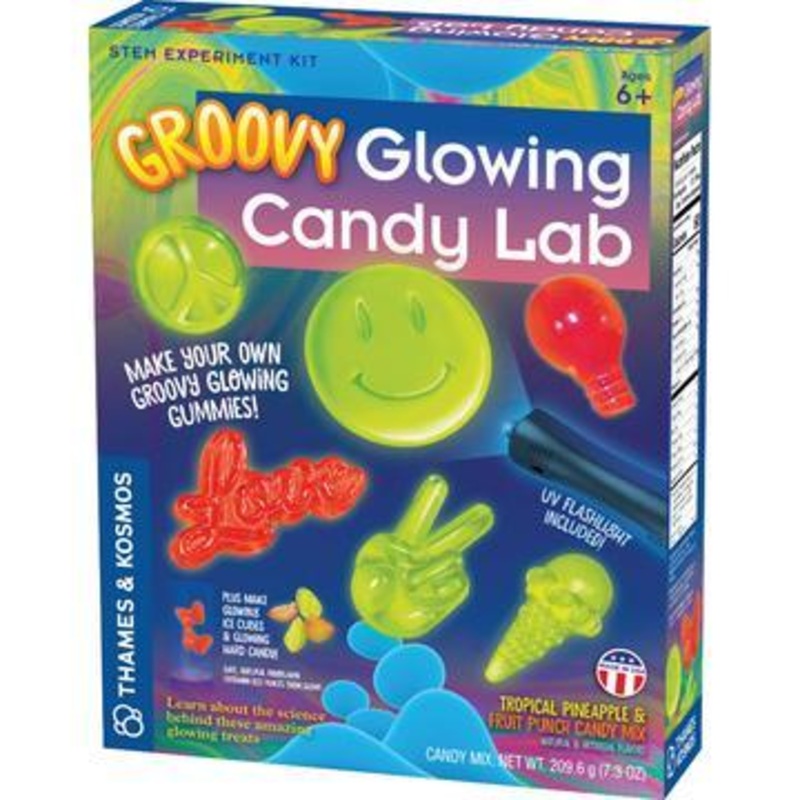 Set the world aglow with peace, happiness, and good times! Make yummy candies that actually glow in the dark. Mold fun, glowing gummies and sweet, glowing ice cubes in groovy shapes. Then make a batch of hard candy and watch it glow. A small amount of a safe, natural ingredient riboflavin, or vitamin B2 causes these candies to glow under the included blacklight flashlight. Learn about the chemistry of glowing materials and pigments, the physics of light and electromagnetic waves, and more science behind these delicious treats. This kit includes all the food ingredients needed for a groovy good time! For ages 6 and up. WARNING: CHOKING HAZARD – Small Parts. Not for children under 3yrs.