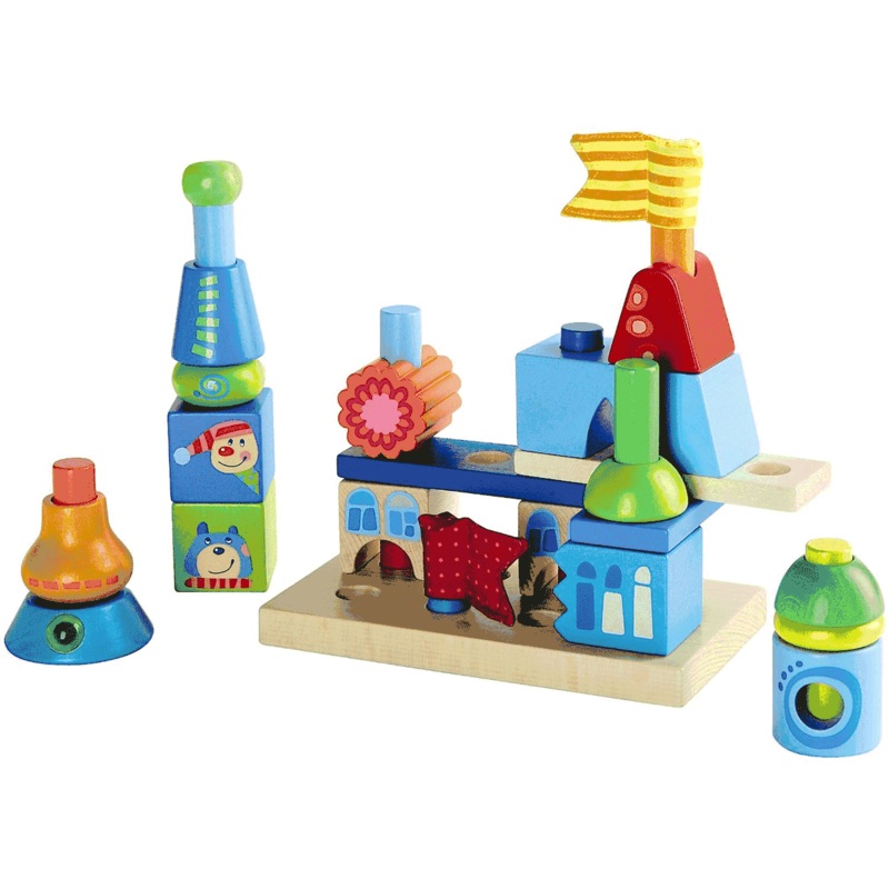 For ingenious architects: the round and angular fanciful blocks can be piled up in many ways to form different fairytale buildings. Unlimited building and stacking fun with a tower pixie, a bear and a cat! 33 pieces of beech wood.