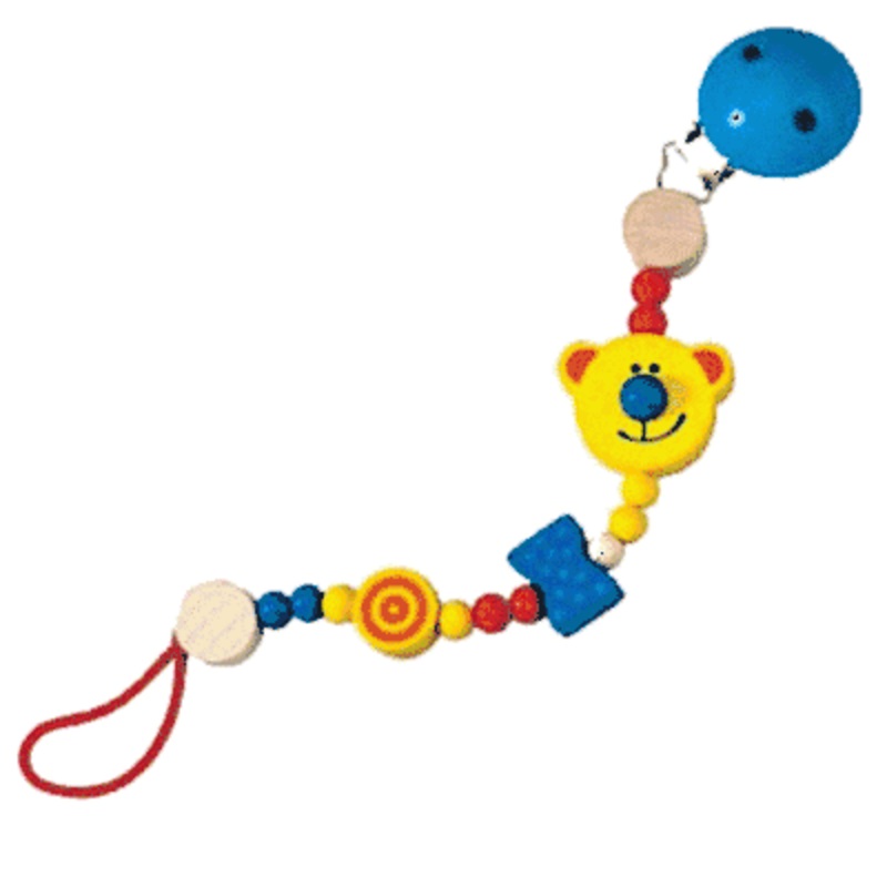 This playful Teddy Bear Pacifier Chain from Haba is made of natural wood and brightly painted with water-based, non-toxic lacquers for a pacifier tether that is safe for baby. Not only does it keep you from losing pacifiers but it also helps to encourage p