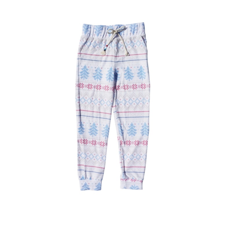 The Winter fair isle print is featured on soft Hacci joggers with our signature Sol Flag drawcord.