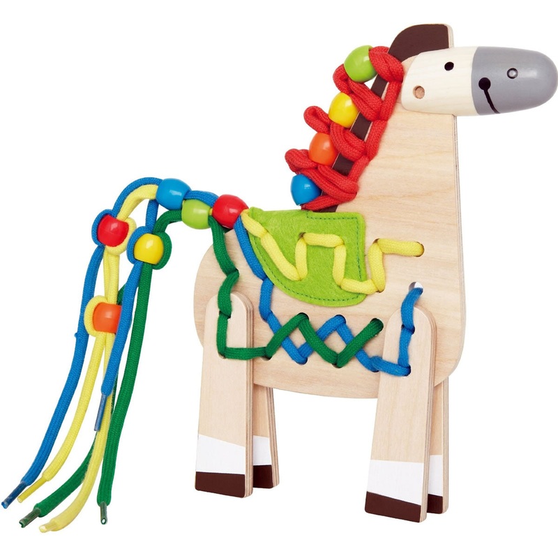 A lace-up mane and tail lets kids customize this pony with color. Name the colors of each lace. Count the holes on the pony. Helps develop fine motor Skills, promotes dexterity , hand-eye coordination and creativity. 20 pieces. Durable child safe paint finish and solid wood construction are hallmarks of Hape toys. Hape’s toys stimulate children through every stage of development and help nurture and develop their natural abilities. All Hape products sold in North America meet or exceed all applicable safety standards.