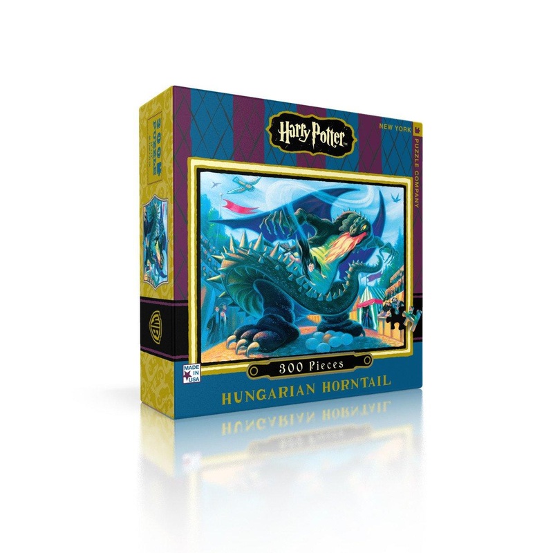 Help Harry Potter outfly and outwit the Hungarian Horntail dragon in this 300 piece jigsaw puzzle from New York Puzzle Company! Illustrated by Harry Potter book cover artist Mary GrandPr, this jigsaw puzzle featuring the first task of the Tri-Wizard Tourna