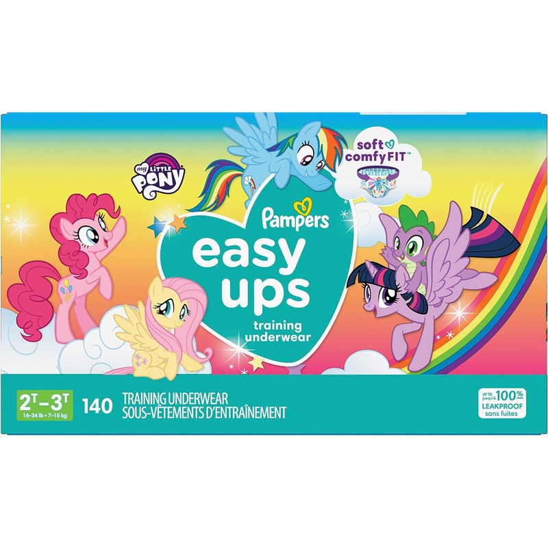 Pampers Easy Ups Girls Boys Potty Training Pants Size 2T-3T, One Month Supply (140 Count), My Little Pony Training Underwear Pampers Easy Ups training pants featuring your favorite My Little Pony characters are a fun and easy way to prepare for underwear.
