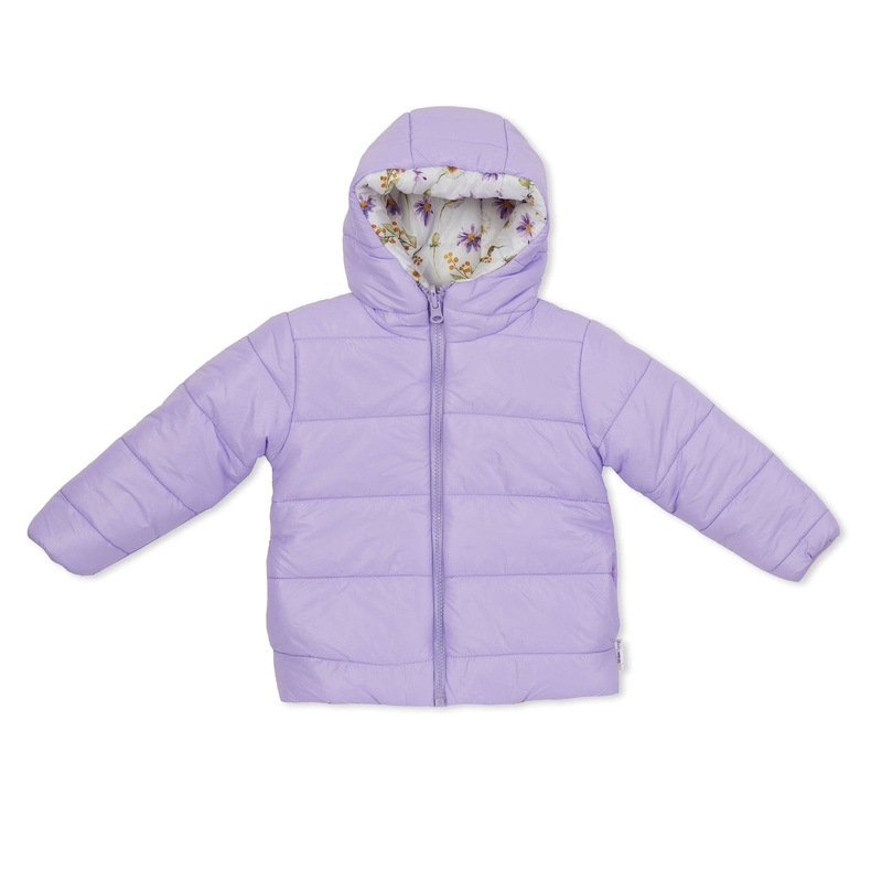 Made from 100% recycled polyester, with an inbuilt hood little one will be toasty warm! This key winter piece is reversible and features a beautiful floral designs on one side and a neutral lilac on the other.