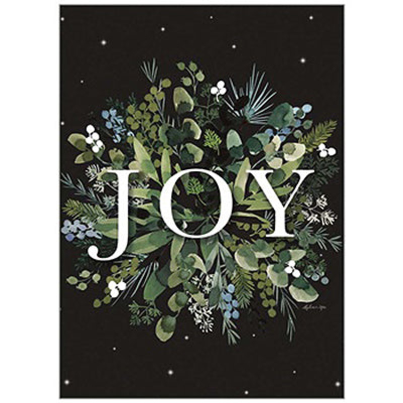 Spread holiday cheer to loved ones with these elegant Joy Christmas Boxed Cards. The front of the card features the word "joy" in white letters against an arrangement of greenery on a dark background.Artist: Stephanie RyanIncludes 20 cards with envelopes
