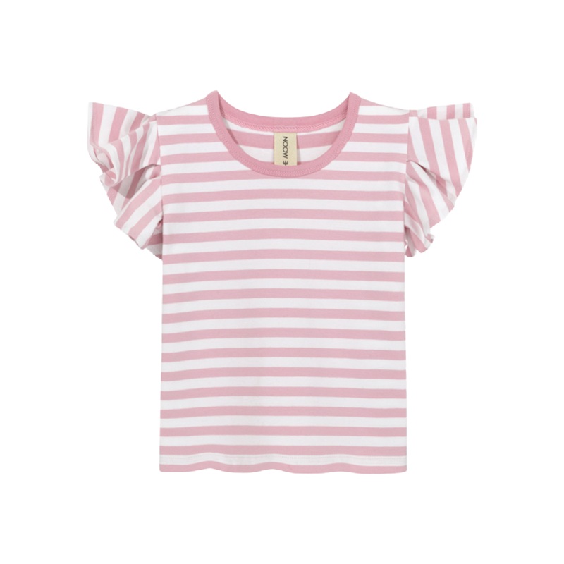 kids on the moon marinaruffle top in pink. this pink and white striped tee featuresa round neck andruffled shoulders.