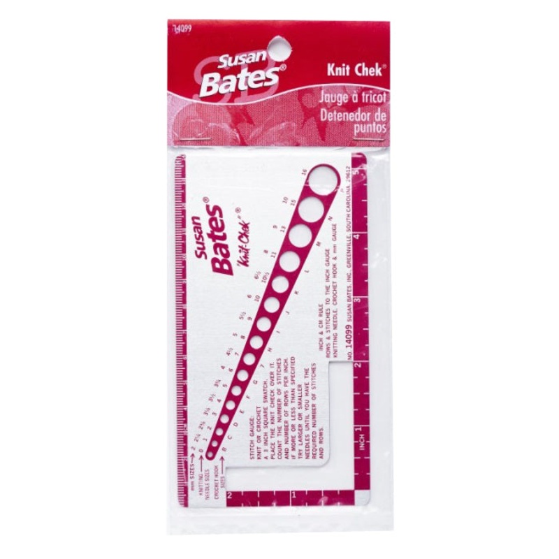 Check your stitch and row gauge with this handy Knit Check-to-Check Stitch Gauge & Needle Size B-14099. Its compact size is perfect for on-the-go projects.Size: 3 x 5.5 inchesMaterial: metalIncludes inch and centimeter rulesFor knitting and crochetingFor c