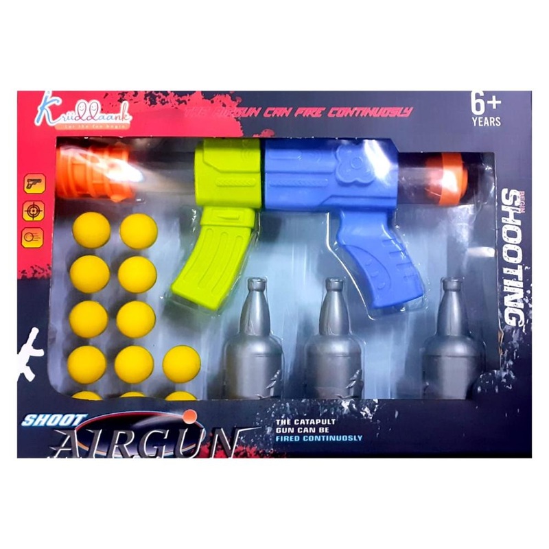 Age : 6 Years+ This blaster gun is made of plastic and balls are made of soft foam, there is no any sharp edges and corners on the gun and bright in colours which makes it very attractive in looks Toy gun is one of the most loving and enjoyable toys among
