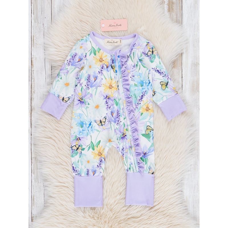 Cozy up your little one in our Lavender Daisy Garden Ruffle Sleeper Pajamas by ! This baby girls gown features a sweet lavender daisy and wildflower print, with a comfortable ruffle zipper closure for easy dressing. Complete the look with our matching slee