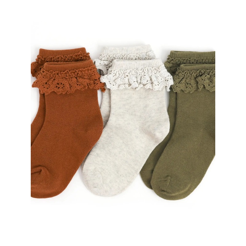 RoadtripLace Midi Sock 3-Pack Contains 3 pairs of adorable lace trimmedmidi socks in the following colors: Heathered Ivory, Olive & Sugar Almond Midi socks are made to hit in between the ankle and lower calf. Variations in sock length are normal. Machine w