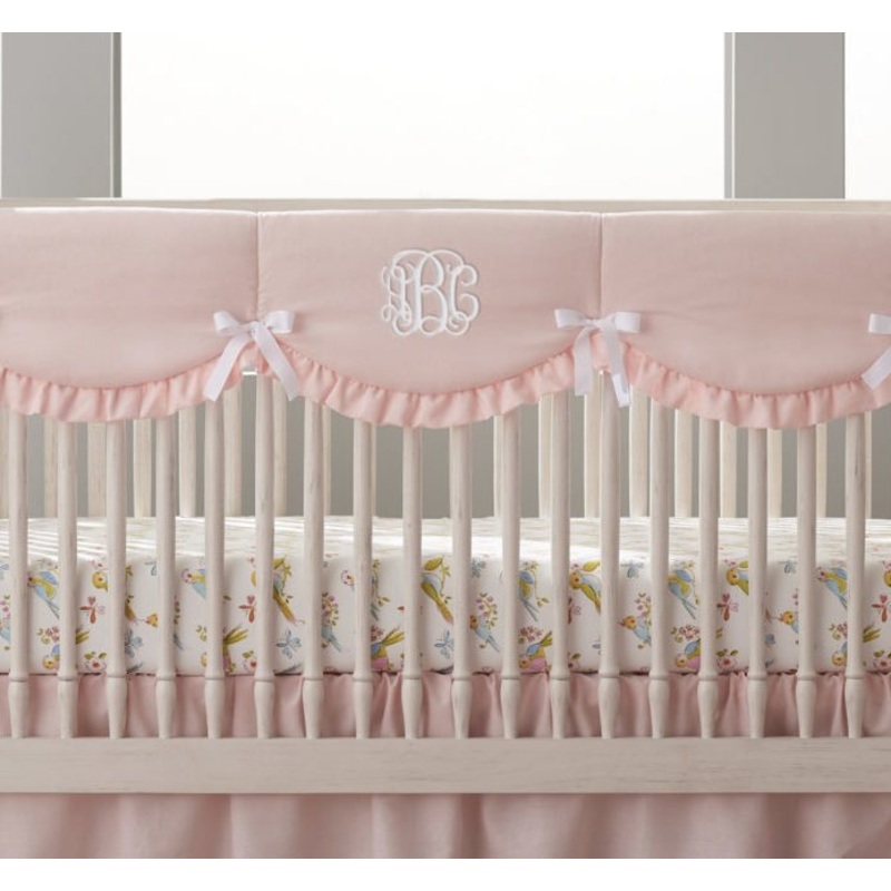 OurPetal Pink Linen Scalloped Crib Rail Coverfeaturesa ruffled trim, also in petal pink linen. You can monogram your petal pink linen scalloped crib rail cover to personalize the nursery.