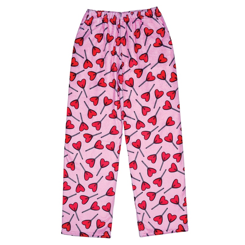 Lollipop heartsprint plush pants, a favorite all year round.Make it a gift!Can be paired with the matchingcosmetics bag or lip gloss.Key Features:100% polyesterBack pocketFabric covered waistbandMachine washable