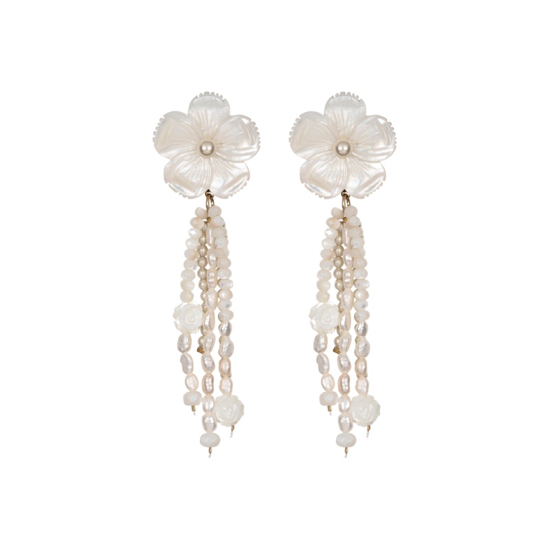 Everything has a story to tell, says Jennifer Behr, the founder of her namesake luxury hair accessory brand that has blossomed into one of New York Citys foremost ateliers for jewelry, as well as bridal. In every crystal, pearl, and ribbon, youll find the utmost quality and a sense of romance, as each piece reveals a modern interpretation of centuries-old regalia. The Mara Earrings bring the glow of luminous pearls in a playful silhouette. Carefully beaded strands of freshwater pearls accented with petite flowers cascade from central carved mother-of-pearl flowers. We love the natural variation of freshwater pearls that makes each earring one-of-a-kind. The length of the earrings adds a graceful sense of movement that lights up the face.