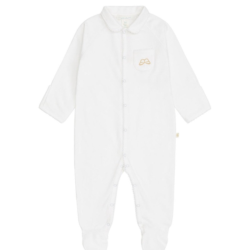 The Angel Wing cotton sleepsuit is made from the finest pima cotton which is both hypoallergenic and breathable. Hand-picked in Peru, our pima cotton is grown without pesticides making it kind to the planet and to young delicate skin. The sleepsuit comes with foldable mittens to keep baby’s hands warm and prevent scratching. Featuring a delicate picot trim and our iconic embroidery on the front.