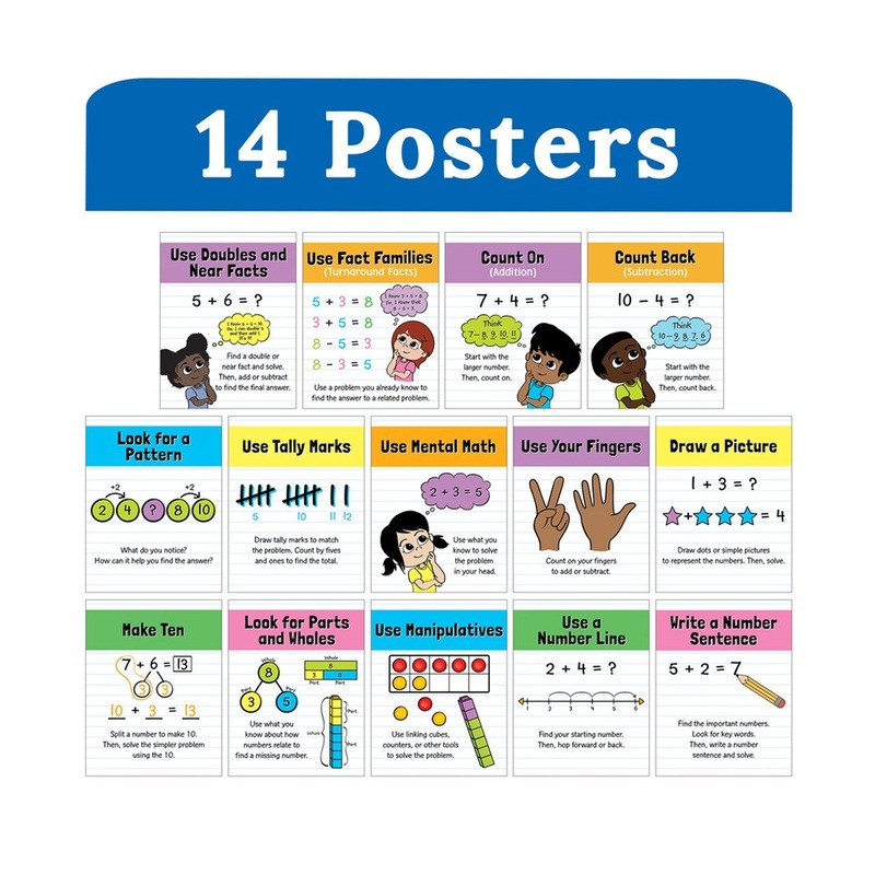 Math Strategies Mini Posters SetDescriptionHelp students succeed with year-round content-rich teaching dcor.The Math Strategies Mini Poster Set offers 14 essential math strategies in an engaging format to help students when they are stuck on math problems.