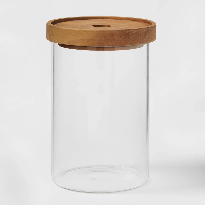 Keep your kitchen supplies contained in beautiful style with this Medium Glass Storage Canister with Wood Lid from Threshold. With the clear glass construction, this food storage canister lets you see when you’re about to run out. The stained wood lid helps keep the contents covered and gives the storage canister a natural, modern aesthetic that you can effortlessly integrate into your kitchen decor.