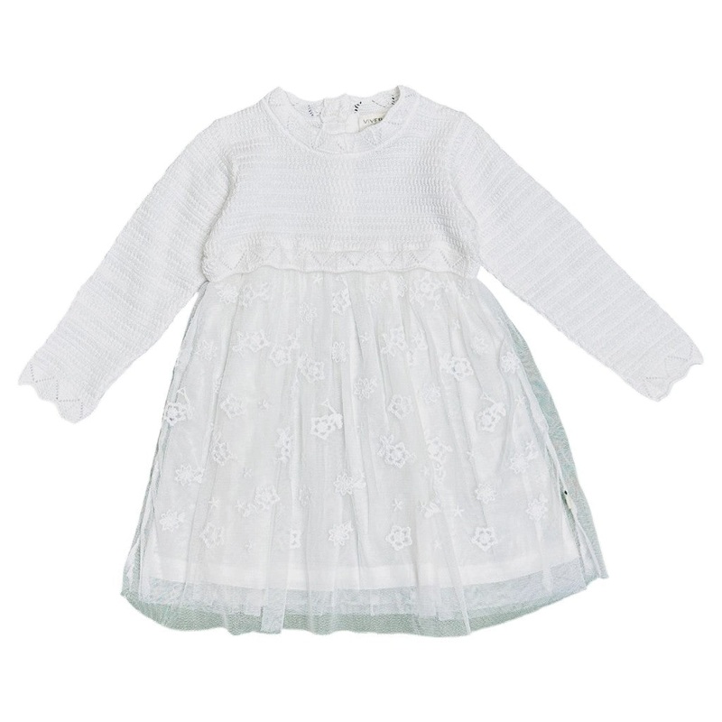 Fancy sweater knit tutu skirt baby dress with a long sleeve knitted bodice top & delicately embroidered tutu skirt. Ivory organic cotton knit top with white floral embroidery on sheer fabric & voile lining on the skirt.Ultra-luxurious & sophisticated style