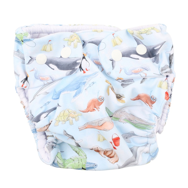 This cute sea creature print aqua nappy is a Summer must have. Made with recycled fabric and lined with an absorbent waterproof backed terry lining this reusable aqua nappy is kinder to the planet and young skin. It features an adjustable waist with press