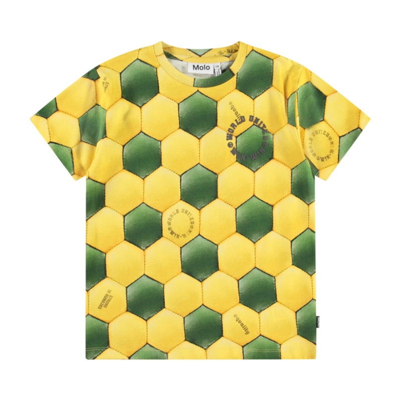 molo riley t-shirt crafted with ethically-sourced organic cotton. yellow short sleeve with an all over yellow and green soccer ball pattern with “world united” text.
