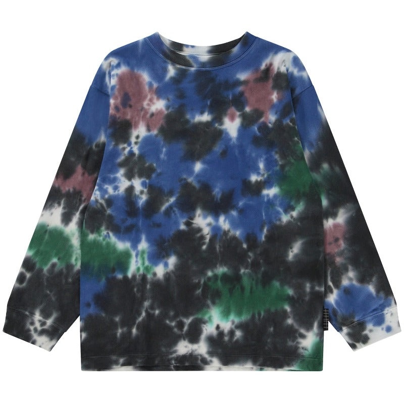 molo rube long sleeve top witha night sky tie dye print.this molo product is GOTS certified organic, which means that it is made with certified organic materials and produced under the strictest social and environmental standards throughout the entire manu