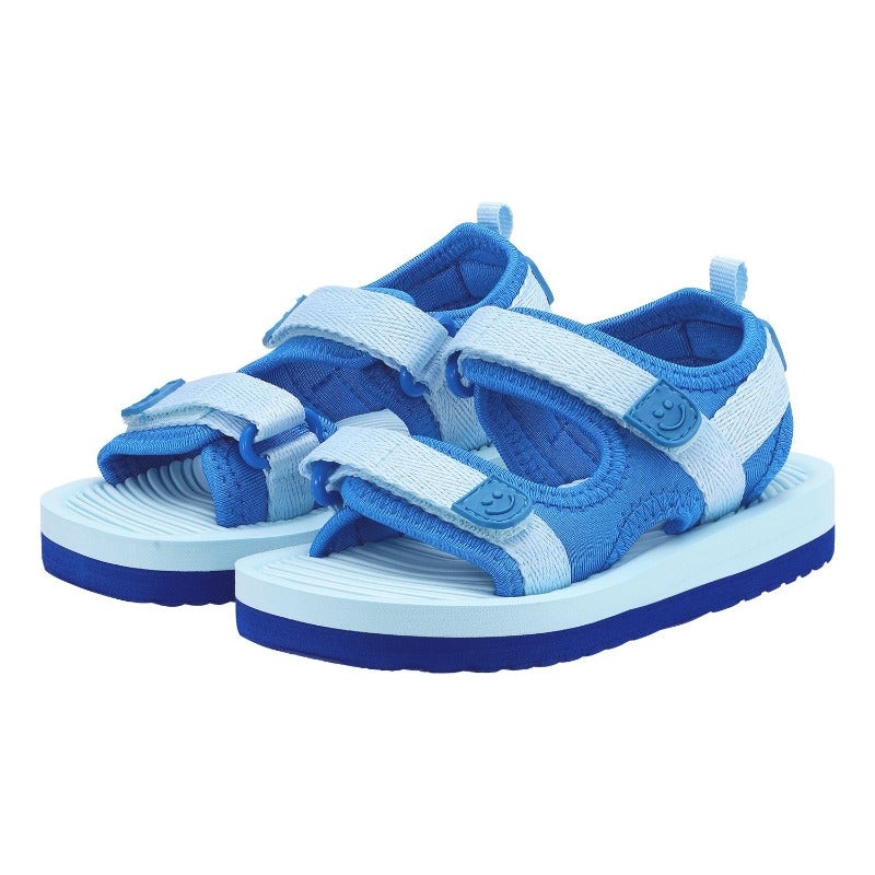 molo zola strappy sandals in vivid blue. water proof and features adjustable velco straps with smiley face accents.